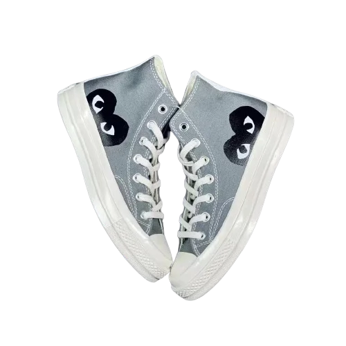The CDG Converse Black Heart Grey High Top blends minimalist style with the playful edge of Comme des Garçons PLAY. Built on the iconic Chuck 70 High Top silhouette, this sneaker features a premium grey canvas upper contrasted by the signature black heart logo with eyes for a subtle yet striking design. With a cushioned insole, reinforced toe cap, and durable rubber outsole, it offers both comfort and long-lasting wear. Perfect for fans of understated streetwear, this collaboration delivers classic Converse heritage with CDG’s avant-garde aesthetic.